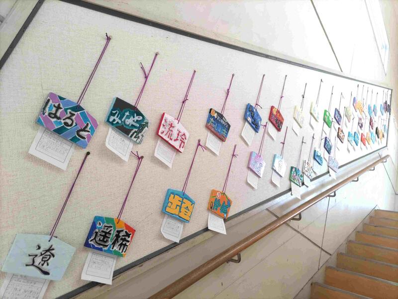 北校舎の廊下、階段の掲示板には、美術作品がたくさん飾られています。