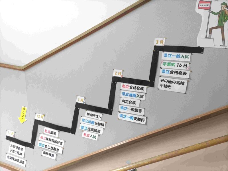 3年生の教室に上がる階段には、受験や卒業までのスケジュールが分かりやすく掲示してあります。受験に対する意識がだんだんと高まってきています。