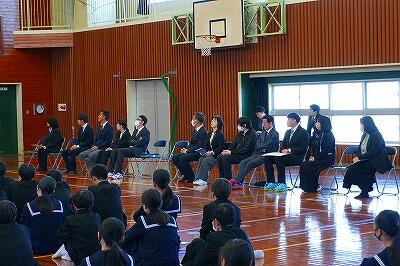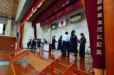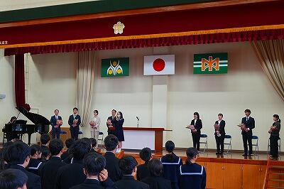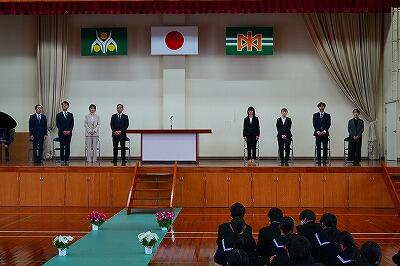 16日(月)、早春の光が届く中、卒業式が、無事に執り行われました。担任の先生から一人ひとりの名前が呼ばれると、会場に響く力強い返事をして、堂々と卒業証書を受け取りました。その姿には、この三年間で積み重ねてきた成長の重みが感じられました。式場には、春を告げる花々がやさしく咲き、子どもたちの門出を祝うかのように彩りを添えていました。多くの保護者の皆様、ご来賓の皆様、在校生、そして先生方が見守る中で、卒業生たちは本校を巣立っていきました。振り返れば、子どもたちは多くの人の支えの中で歩みを重ねてきました。その支えがあったからこそ、今日という日を迎えることができたのだと思います。四月からは、それぞれが新しい場所へと進みます。どうか自分の夢を胸に、大空へと力強く舞い上がってください。皆さんのこれからの人生航路が、希望に満ちたものとなることを心から祈っています。保護者の皆様、ご来賓の皆様、地域の皆様が、日々温かく見守り、支えてくださったことが、子どもたちの今日の姿につながっています。心より感謝申し上げます。ありがとうございました。