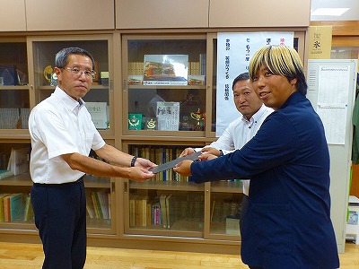 25日(月)の午後、JAみやざき綾町地区本部様より、反射タスキを贈っていただきました。今のこの時期は日没が早くなっており、部活動を終えて帰る頃には、暗くなっています。本日いただいた反射タスキを活用して、生徒が安全で安心して下校できるように努めてまいります。ありがとうございました。