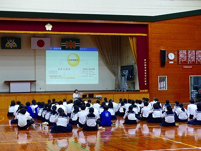 21日(月)の4校時、3年生を対象にした租税教室が行われました。宮崎税務署から講師の先生を招き、アニメの鑑賞をしたりスライドを使った説明を聞いたりしました。講師の先生から、税の使いみちや税の役割、税の必要性について分かりやすく話をしていただきました。生徒の皆さんは真剣に耳を傾けていました。将来の納税者としての資質を養うことができたことと思います。講師の先生、ありがとうございました。
