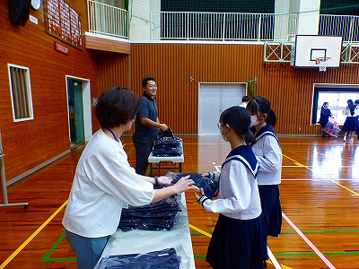 22日(火)の6校時、照葉樹林綾マラソンの事前学習会をしました。マラソンは10月27日(日)に開催されますが、この日は、地域貢献活動日ということで授業日となります。生徒たちは、ランナーとして走ったり応援で盛り上げたり、また給水スタッフなど、それぞれが役割をもって参加します。大会事務局から当日着用するシャツが届き役割ごとに生徒に渡しました。また、当日にどのような形で地域貢献ができるのか、事前の打ち合わせもしました。マラソンの参加者が2500名を超えると聞いています。綾中学校が一丸となって地域の行事を盛り上げます。