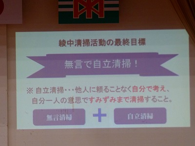 24日(木)の4校時、清掃集会を開きました。綾中の清掃の意義を、生徒会役員が説明したり好ましい清掃の仕方についての寸劇をしたりしていました。清掃場所がこれまでとは変わるため、新しい清掃場所での手順なども確認していました。日々の清掃活動の充実に期待したいところです。