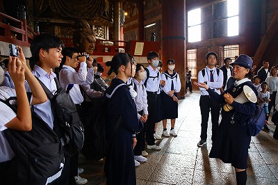 昼食をすませ、バスで薬師寺に向かいました。ここも世界遺産です。生徒たちは、お坊さんの説法を聞きました。ユーモアを交えた話に真剣に耳を傾けていました。