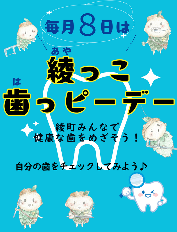 令和7・8年度 生きる力を育む歯・口の健康づくり推進校の指定を受け、本年度から本校をはじめ町内の小学校や保育所などとが一体となった取組を始めています。毎月8日を、「綾っ子歯っピーデー」に設定し、その啓発用チラシを作成したところです。なお、綾町のマスコットキャラクター「もりりん」の歯科バージョンのイラストは、本校3年生の生徒が描いてくれました。