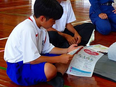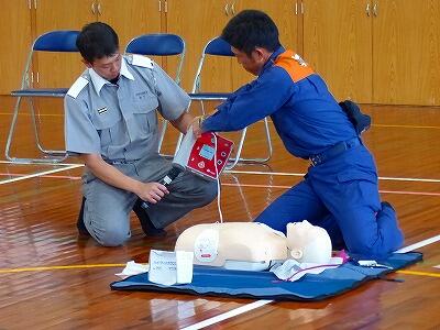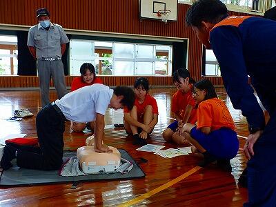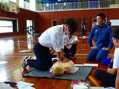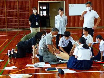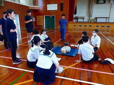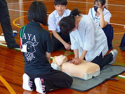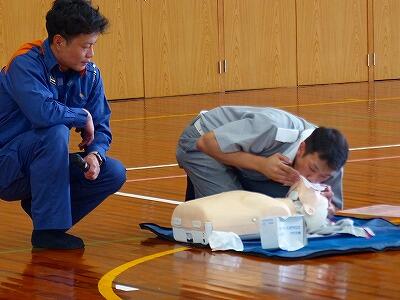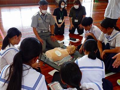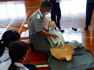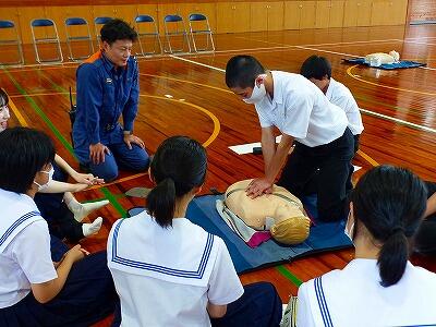 11日(水)の放課後、部活動の代表生徒と職員が参加し、北消防署西部出張所の方々から心肺蘇生法やAEDの使い方、熱中症予防について学びました。倒れている人を見つけたら、まず反応を確認し、なければすぐに周囲に助けを求めること。そして胸骨圧迫、人工呼吸、AEDの使い方など、命を守るために大切な手順を丁寧に分かりやすく教えていただきました。実際に体を動かしながら学ぶことで、いざというときに「どう動くか」がはっきりイメージできたことは大きな収穫です。この研修は、人の命を救う可能性がある力を、一人ひとりが確かに手にした、大変意義ある時間となりました。研修会を企画していただいた担当の先生、ご指導をいただいた西部出張所の皆様に感謝申し上げます。ありがとうございました。
