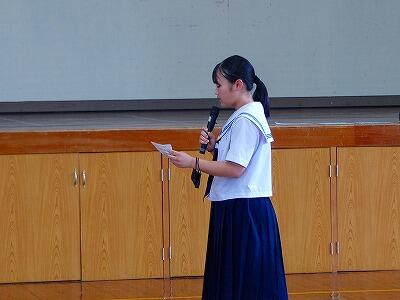 4日(金)の午後、先日の地区大会を勝ち抜き、見事に県大会への切符を手にした部活動や社会体育競技等、及び県吹奏楽コンクールに出場する吹奏楽部の皆さんへの激励会がありました。それぞれが大会に挑むにあたっての決意を述べました。県大会は、5日(土)から一部の競技が始まっています。今月いっぱいかけて行われる予定です。皆様のご声援をどうぞよろしくお願いいたします。