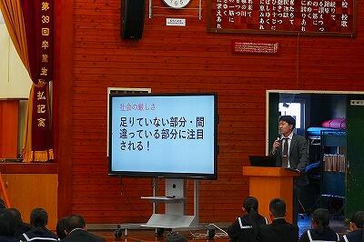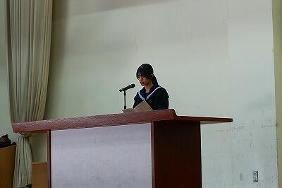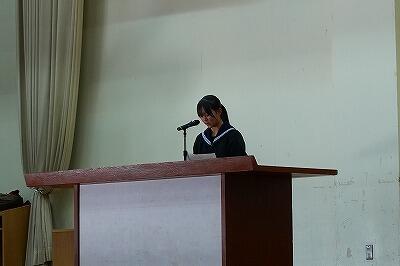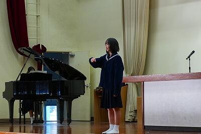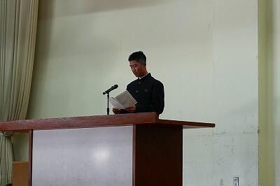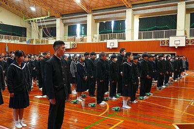 24日(水)、2学期の終業式を行いました。代表生徒4名が登壇し、2学期を振り返るとともに、3学期に向けた抱負を発表しました。いずれの発表からも、自分自身の取組を丁寧に見つめ直し、次への目標を明確にしようとする姿が伝わってきました。また、担当の先生方からは、冬休みの過ごし方についての話があり、生徒一人ひとりが安全で充実した休みを意識する機会となりました。この2学期、保護者の皆様、地域の皆様の温かなご支援のもと、生徒たちは様々なことに挑戦し、地域社会との関わりの中で成長することができました。心より感謝申し上げます。ありがとうございました。3学期も引き続き、どうぞよろしくお願いいたします。
