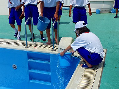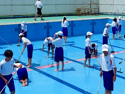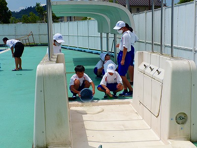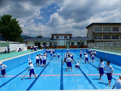 4日(火)の午前中、1年生がプール清掃をしました。ブラシを使って汚れを落としたり、バケツに水を汲んで水を流したりと、分担して行いました。予定では、来週から水泳の授業が始まります。青空のもとでの水泳の授業を楽しみにしている人もいると思われます。1年生の皆さん、清掃ありがとうございました。きれいになりました。