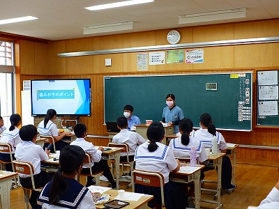 10日(金)の4校時、3年生のクラスで、学坦と養教の先生とのティームティーチングによる保健教育がありました。「メンタルヘルス~自分の心の健康を守るために~」という題材で授業が行われ、生徒は真剣に取り組んでいました。養教の先生から、簡単にできるリラクセーションの方法が紹介され、心の健康の保ち方を理解することができました。貴重な学びになったことと思います。