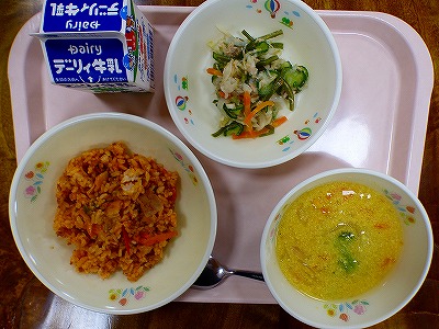 5日(水)の給食に、アメリカ南部ルイジアナ州の郷土料理「ジャンバラヤ」が出ました。1年生の教室に行くと、おかわりをしている生徒がたくさんいました。コーンスープも野菜がたっぷりと入っており、ジャンバラヤによく合いました。茎わかめのカミカミサラダも素材のうまみが生きていました。給食に関わっていただいているすべての皆様、いつもありがとうございます。