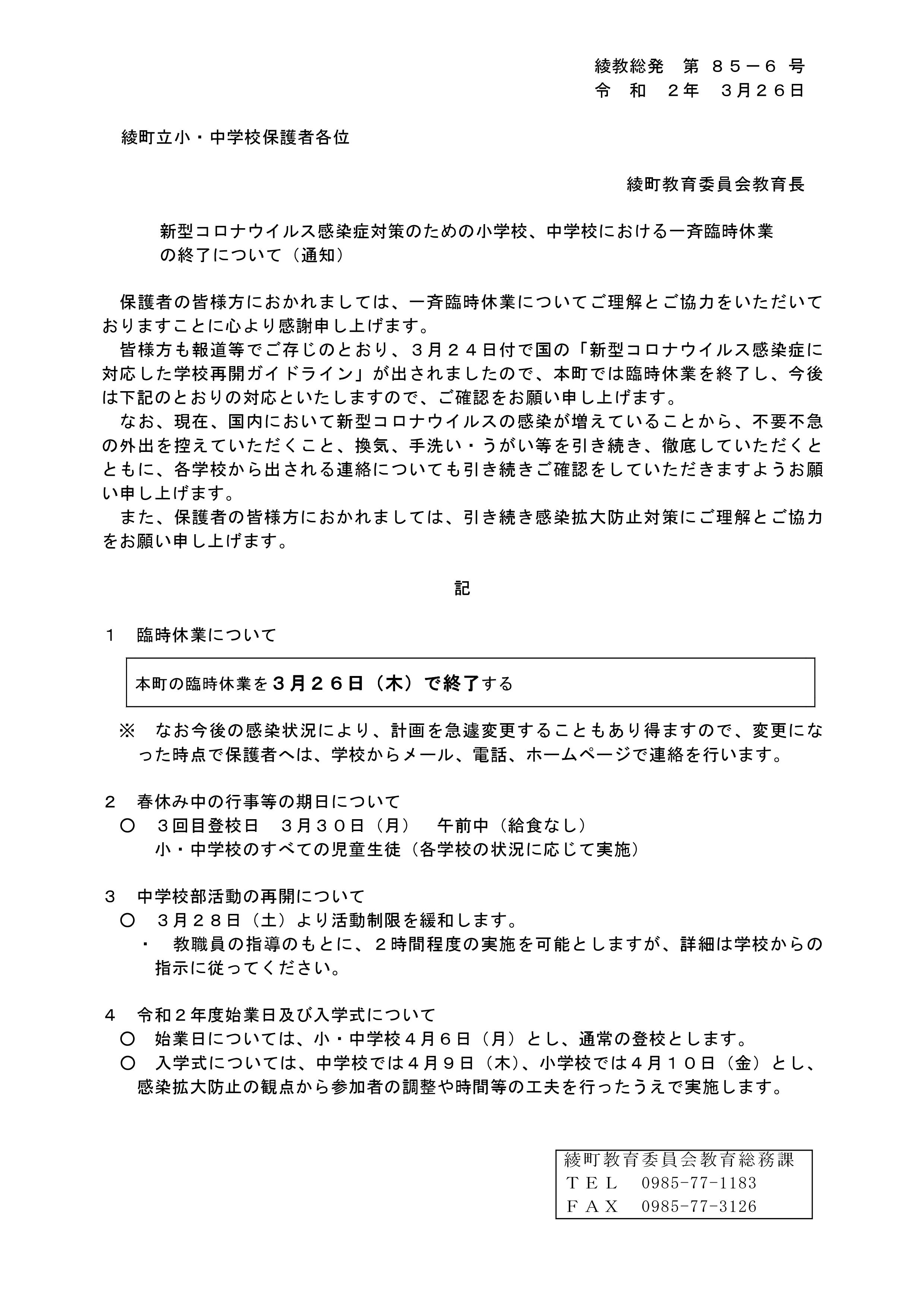 ※原文(PDF版)はこちら。→R02_0326_町教委_一斉臨時休業の終了.pdf