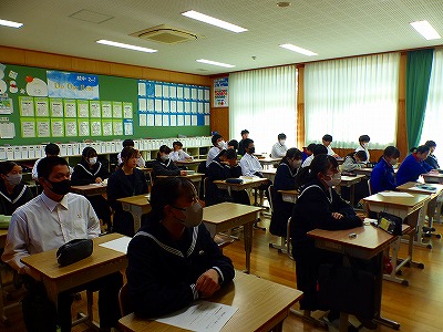 28日(木)と29日(金)の2日間で、みやざき学習状況調査が行われます。対象は1年生です。先生から調査の受け方について説明がありました。この調査は、タブレット端末にログインしてから問題を解く仕組みになっていますが、初日は大きなトラブルも発生することはありませんでした。生徒たちは真剣に向き合うことができていました。