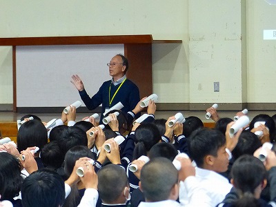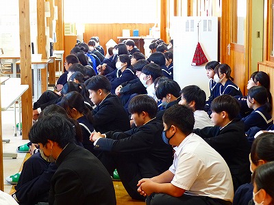 6日(金)の4校時、1年生がイオンの森調査活動をするに当たり、その事前学習を行いました。イオンの森には現在、木々が植えられています。毎年、木々の成長の様子など調査に行きますが、事前に綾ユネスコエコパークセンターの職員の方々から調査内容や方法などについて詳しい説明がありました。また、森林が人々に及ぼす影響につてもしっかりと学習することができました。調査活動は、12月13日(金)の午前中にあります。綾ユネスコエコパークセンターの皆様、ありがとうございました。