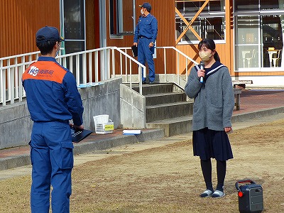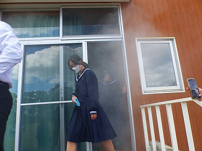 29日(金)の4校時、火災を想定した避難訓練が行われました。初めに、本校卒業生の消防士の方からの講話がありました。今回の訓練では、害のない煙を使用し、煙が充満する廊下を実際に避難する体験が組み込まれました。煙で視界が悪くなる中、生徒たちは壁に手をつきながら避難経路を進み、火災現場での恐怖感を体感しました。防火扉が実際に閉まった中での避難体験もできました。また水消火器を使った初期消火訓練が、給食室の先生を対象に行われました。今回の訓練を通して火災発生時の迅速で安全な避難方法などについて学ぶことができました。企画をしていただいた担当の先生、事前の準備から当日の運営にいたるまでありがとうございました。今回、ご指導ご協力をいただいた宮崎市北消防署(西部出張所)、赤木防災様に心より感謝申し上げます。ありがとうございました。