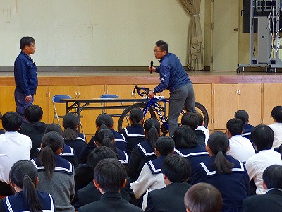 9日(月)の授業終了後、自転車の乗り方についての交通安全教室がありました。宮崎県自転車競技連盟の方々を講師にお招きしました。自転車も軽車両の一つであることを踏まえた上での具体的な話がありました。まず、乗る際には左側から乗ること、左右確認は、右→左→右ですることを再確認しました。自転車も自動車と同じで左側通行となっているためです。さらに、ある一定の速度を保つことも話されました。大変勉強になることばかりでした。これを機会に正しい知識をもって安全な自転車の乗り方を心がけたいものです。講師の先生方、ありがとうございました。