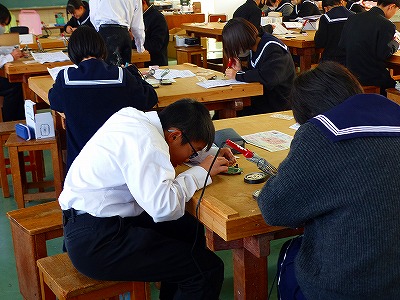 11日(水)の午前中、2年生が技術の授業でダイナモを製作していました。ダイナモとは、緊急時に役立つラジオや携帯の充電機能、懐中電灯などの機能を備えており、大変便利な物です。生徒たちは、基板に電子部品をはんだ付けする作業を行っていました。はんだごての先の温度はとても高くなっています。一心不乱に取り組む生徒の姿が大変印象的でした。また、作業にともない業者の方にもサポートをいただきました。ありがとうございました。