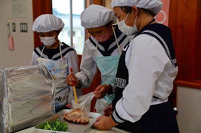 31日(木)の5・6校時に、1年生が調理実習をしました。豚肉のしょうが焼きと、ピーマンの炒め物です。なかなかの包丁さばきでピーマンを切っていました。豚肉を調味料に漬け込み、フライパンで焼きました。しょう油の焼ける匂いは食欲をそそります。匂いに誘われたのか、他の教室で授業をやっていた生徒たちが、休み時間に家庭科室に来ていました。後片付けもしっかりとした後、振り返りを行っていました。よい実習ができていたようです。