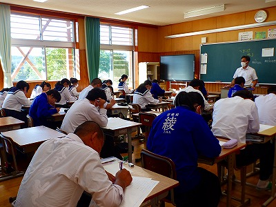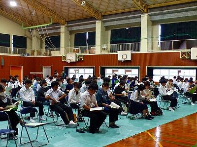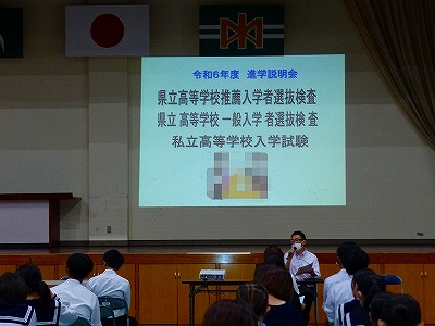 1日(金)の6校時、進学説明会を行いました。3年生は大きな学校行事も終わり、いよいよ受験モードに入っていきます。説明会では、学年担当の先生から、詳しい資料やプレゼンを使っての細かな説明がありました。これから進路を決定していく時期になります。保護者の方との十分な話し合い、先生方の助言などを参考にしながら、悔いのない進路が決められることを願います。