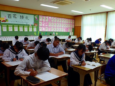6日(水)の1校時、全学級で硬筆検定に取り組みました。学年によって出題内容は変わりますが、どの学年もある文章を文字の大きさや行の中心、字形などに気をつけ、楷書で書くものでした。また、俳句を行書で書いたり漢字の筆順を答えたりする問題もありました。どの学年ともに真剣な態度で集中して取り組めていました。