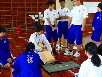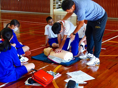 6日(水)の3、4校時、2年生が保体の授業で、救命救急について取り組みました。保体科の先生と養護教諭の先生とのティームティーチングによるものです。宮崎市消防局(西部出張所)様より訓練用の人形やAEDをお借りしました。ありがとうございました。先生から心肺蘇生についての説明を受けた後、人形を使って実際に胸骨圧迫を行いました。続いて、AEDを使う訓練をしました。2年生は、17日(日)から修学旅行に行きます。緊急時への対応として、この学びは貴重な経験になることと思います。