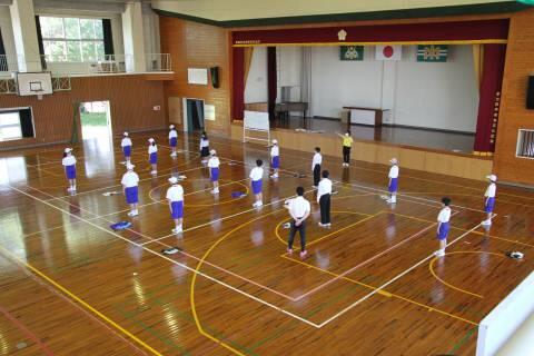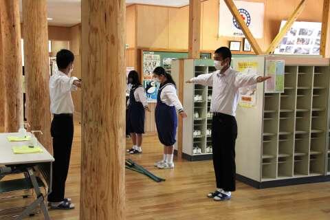 今日の体育の学習活動では、ソーシャルディスタンスを確保しながら、その場で様々な動きの確認をしていました。
