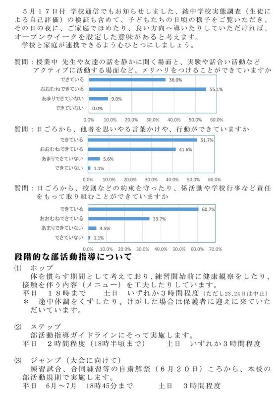 3 部活動については、昨日の学校通信(5月21日版)でお知らせしたとおり、感染拡大防止策を取った上で、段階的に通常の活動に戻していきます。