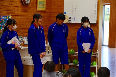 16日(月)の午前中、3年1組の生徒が保育実習を行いました。町内の保育所や幼稚園を訪れ、家庭科の時間に作成した絵本を使ってクイズを出したり、外遊びなどをしたりしました。園児たちは、「〇〇お姉ちゃ~ん、お兄ちゃ~ん」と呼び合いながらとても楽しそうに過ごしていました。この保育実習は他の学級でも計画されています。