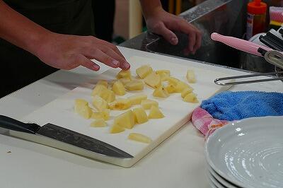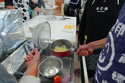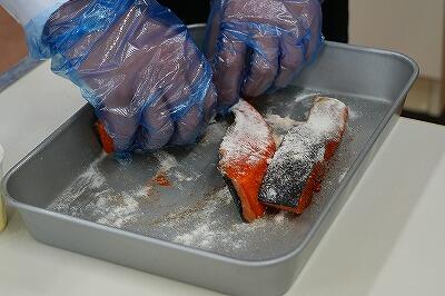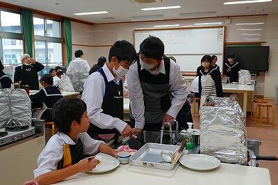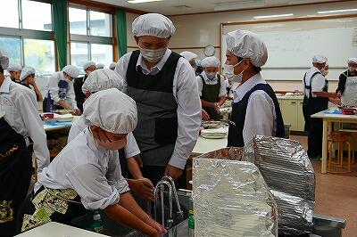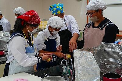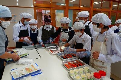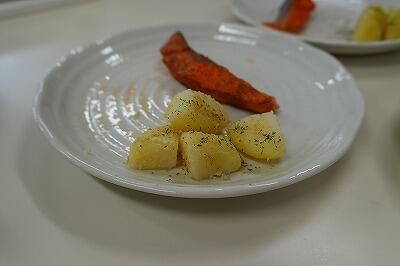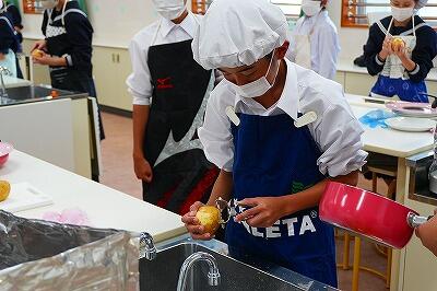 11日(火)、1年生が家庭科の調理実習で「鮭のムニエル」と「粉ふきいも」に挑戦しました。鮭は塩こしょうで下味をつけ、片栗粉をまぶしてフライパンで焼きます。焼き上がるにつれて、香ばしい香りとバターの風味が教室中に広がっていきました。粉ふきいもは、じゃがいもの皮むきから始まり、ゆでた後に水分を飛ばして仕上げます。鍋の中で白く粉をふくように仕上がったじゃがいもは、見た目にもほくほくと温かそうでした。生徒たちは先生方のサポートを受けながらも、手際よく作業を進め、どの班の料理もおいしそうに完成しました。調理の過程を見ているだけでも、達成感と満足感が伝わってくる実習となりました。