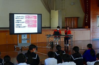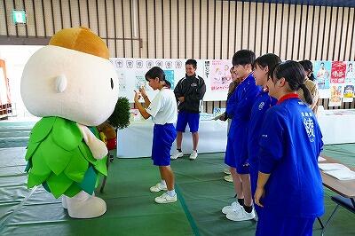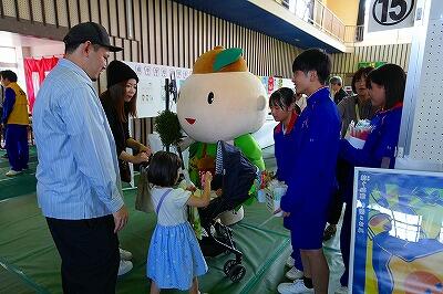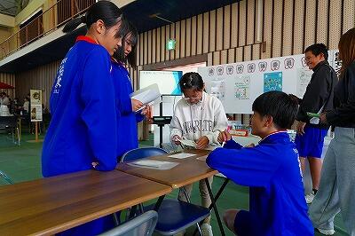 綾町文化祭で、本校保体委員会の生徒たちが「歯・口の健康ブース」を開設しました。生徒たちは事前に、歯に関する大人向けと子ども向けのクイズを考え、来場者の方々に声をかけながら参加を呼びかけました。クイズに挑戦してくださった方には歯ブラシをプレゼントし、歯に関する標語募集への協力もお願いしました。当日は綾町のマスコット「もりりん」も登場し、会場を和ませてくれました。生徒たちは、担当の先生の助言を受けながら、自分たちでできることを考え、工夫を重ねて実行に移しました。地域の皆様と触れ合いながら健康の大切さを伝える大変貴重な機会となり、生徒の主体性と実行力が光る取組となりました。積極的に参加した生徒の皆さん、そして温かく見守っていただいた保護者の皆様にも心よりお礼申し上げます。また、これまで準備や運営を支えてくださった担当の先生に感謝申し上げます。「もりりん」専用の歯ブラシは、本校用務員の先生の手作りです。ありがとうございました。