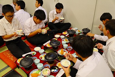 みんなで食べる夕食も最後です。今夜も、おいしそうな料理が並べられ、たっぷりと楽しんで食べていました。一日、京都市内を歩き回ったので、お腹も空いていたことと思います。