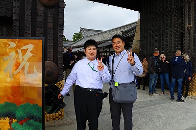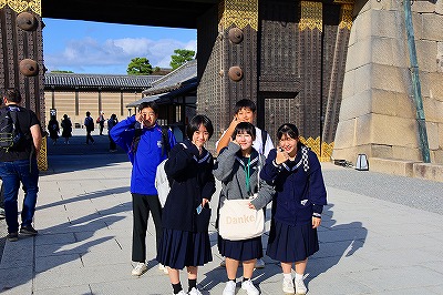 朝の8時15分からスタートした自主研修が、夕方5時に終わりました。事前に計画した通りにほぼ順調に行動できた班もあれば、計画からは少し変更をした班もあったようです。チェックポイントの二条城ではグループ写真を撮ることができました。集合時間の夕方5時には全部の班が旅館に戻ってきました。これから夕食になります。