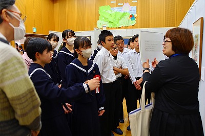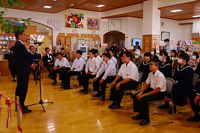 20日(水)の午前中、旅する美術館のオープニングセレモニーが、綾てるは図書館で開催されました。この日は振替休業日ではありましたが、野球部とバスケット部の生徒がセレモニーに参加し、代表の生徒がテープカットを行いました。その後、県立美術館の方から作品の鑑賞の仕方について説明がありました。鑑賞に正解はなく、その人なりの方法で鑑賞すればよいとの話があり、生徒たちは思い思いに作品を見ていました。参加した生徒の皆さん、顧問の先生方、ありがとうございました。旅する美術館は、綾てるは図書館で、20日(水)~24(日)までの5日間開催されます。ぜひ、足をお運びください。