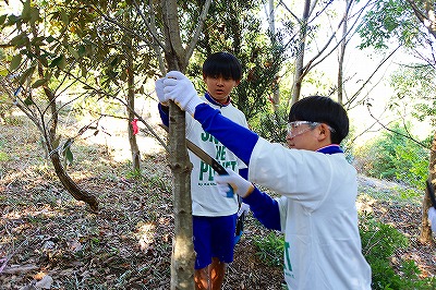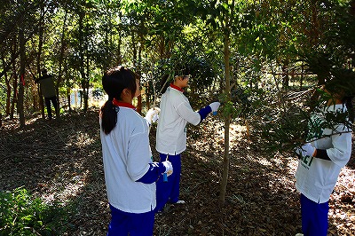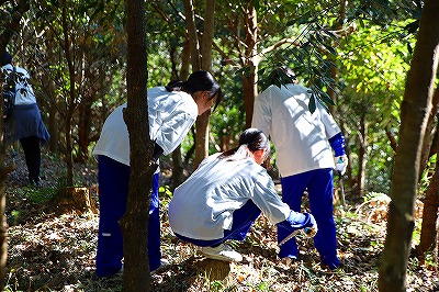 23日(土)の午前中、本校生徒(3年生、吹奏楽部員)がボランティア活動の一環として、イオンの森育樹活動に参加しました。イオンの森とは、綾中学校の校舎建て替えのためにスギを伐採した町有林を里山に復元しようと、2013年から保全活動を行っている森のことです。この日は、綾中生をはじめ県内外から、約250名ものボランティアの方々が参加して、枝打ちや下刈り作業などに汗を流しました。昼食には猪汁などがふるまわれ、おいしそうに食べていました。ボランティアとして参加した生徒の皆さん、引率をしていただいた先生方、大変お疲れ様でした。ありがとうございました。