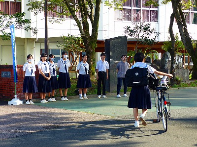3連休明けの17日(火)から、朝のあいさつ運動が始まりました。初日は、生徒会役員の皆さんが、正門付近に立って、登校してくる生徒に対してあいさつを交わしていました。自ら進んであいさつが交わせるようになることを期待しています。今後、部活動単位でも行っていきます。