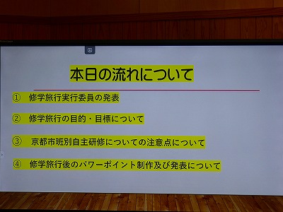 13日(金)の4校時、2年生はてるはの時間に、修学旅行についての説明がありました。まず、修学旅行実行委員会の皆さんが紹介されました。これから、スローガン作成など中心となってみんなをまとめていきます。頑張ってください。次に、学年主任の先生から旅行の目的や、綾町と京都市の共通点や違いなどについて学習を深めていくといった学びがあることも話されました。修学旅行は、11月17日(日)~19日(火)関西方面で計画されています。