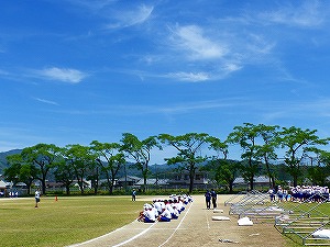 17日(金)は、朝から爽やかな日差しが注ぐ中、3、4校時に体育大会に向けた最後の練習を行いました。15日の予行練習で課題が残ったところを中心に練習して、最後の確認をしたところです。午後は、準備や役員の最後の確認をして、明日の本番に備えます。五月の青空が映えています。とってもいい青空です。