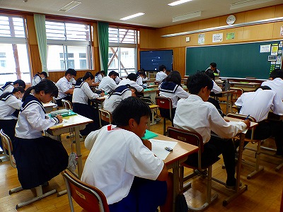 19日(日)は、授業日でした。前日に開催した体育大会の後片付けを全校生徒で行いました。決められた時間内でスムーズに片付けることができました。生徒の皆さん、協力ありがとうございました。その後、体育大会の振り返り集会をしました。教室に戻ってからは、振り返り用紙に真剣に向き合い、それぞれに大きな行事を成功させた後の振り返りがしっかりとできていたようです。1年生の教室に記載されていためあてにも注目です。