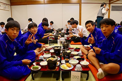 みんなで食べる夕食も最後です。今夜も、おいしそうな料理が並べられ、たっぷりと楽しんで食べていました。一日、京都市内を歩き回ったので、お腹も空いていたことと思います。