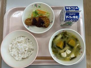今日の献立は、麦ごはん、ホキフライ、かぼちゃのみそ汁、ゆでキャベツでした。