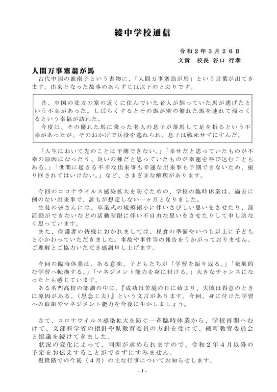 原文はこちらをご覧ください。 → 綾中学校通信3月30日号