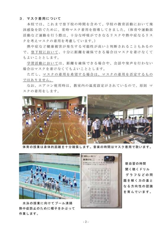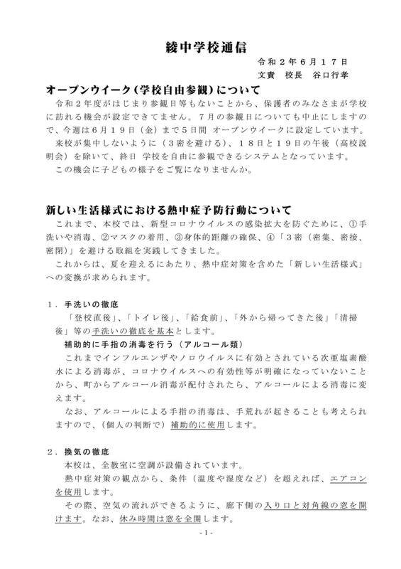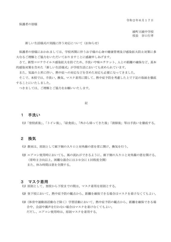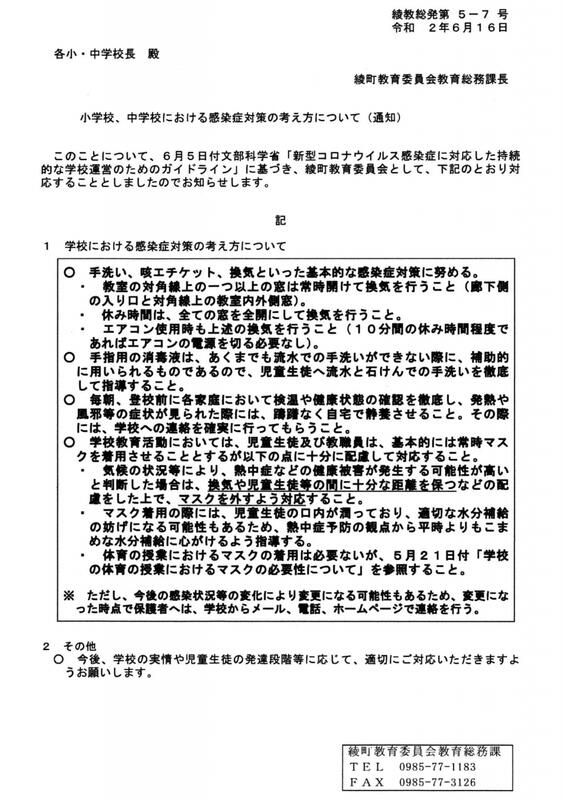 以下の、綾町教育委員会「小学校、中学校における感染症対策の考え方について」の通知をうけ、手洗い、換気、マスク着用についての取組についての文書を配付いたしましたのでご確認をお願いいたします。
