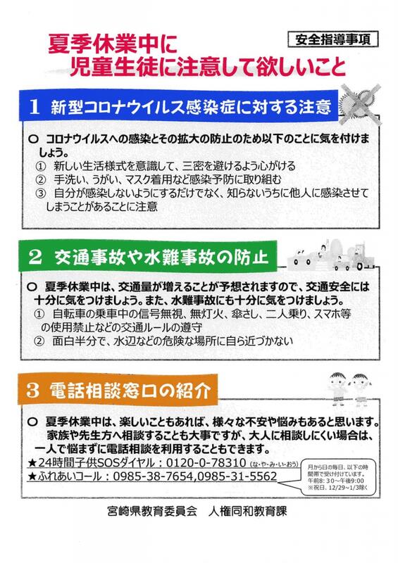 宮崎県警察本部より冬休みの過ごし方について注意喚起のお知らせが来ています。年末年始は楽しい行事がたくさんある一方、交通面や対人関係、不良行為などによるトラブル起こりやすくなります。安心安全に過ごすことができますように、ご家庭で生徒と一緒にご一読下さい。R6 生活安全少年課・冬季休業前保護者啓発リーフレット.pdf