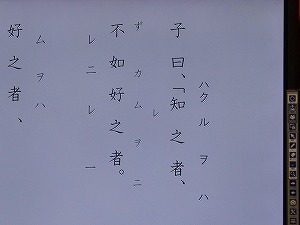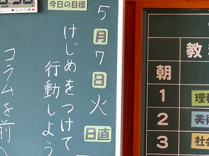 大型連休が終わり、学校に活気が戻ってきました。2年生のクラスでは、ALTの先生と一緒になって真剣に学習していました。3年生のクラスでは、漢文を学習していました。訓読では、返り点をしっかりと理解することができていたようです。特に、一二点とレ点が混じった漢文は、訓読するのに少し考えたかもしれません。連休中の課題も提出されていました。あるクラスの今日の目標も、連休明けにふさわしいものとなっていたようです。