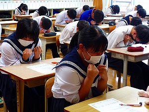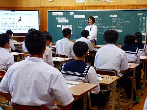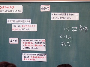 10日(金)の4校時、3年生のクラスで、学坦と養教の先生とのティームティーチングによる保健教育がありました。「メンタルヘルス~自分の心の健康を守るために~」という題材で授業が行われ、生徒は真剣に取り組んでいました。養教の先生から、簡単にできるリラクセーションの方法が紹介され、心の健康の保ち方を理解することができました。貴重な学びになったことと思います。