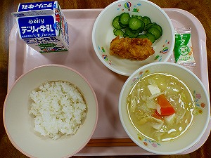 15日(水)の給食は、「ひむかの日」献立でした。メニューは、麦ご飯、千切り大根のみそ汁、チキン南蛮、きゅうりの塩もみです。宮崎産のもも肉、綾町産のきゅうり、人参、大根などの野菜を使って作られています。午前中は、体育大会の予行練習が行われ、さぞかしお腹もすいていたことと思います。おいしくいただきました。調理員さんをはじめ、給食に関わっていただいているすべての皆様に感謝申し上げます。ありがとうございます。