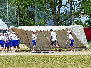 体育大会に向けて舞台が整いました。18日(土)は、天気も心配なさそうです。ただ、日差しが強くなるかもしれません。生徒用テントをはじめ、救護用テント等には、強い日差しを遮るために、寒冷紗を準備しました。最高の舞台で、最高のパフォーマンスを発揮してくれる綾中生にエールを送ります。ご家族、地域の皆様、体育大会でのご声援、どうぞよろしくお願いいたします。お待ち申し上げています。