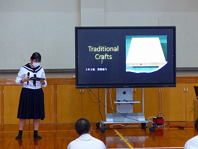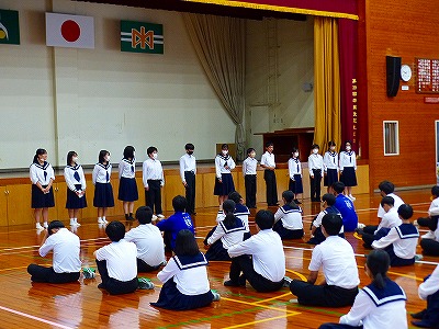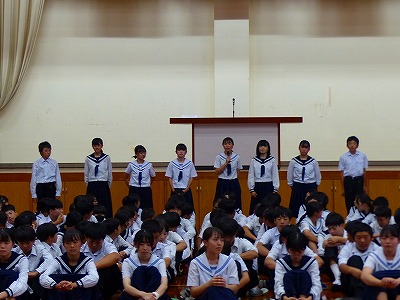 22日(水)の午後、1年生の学年集会が開かれました。各学級で代表となった、国語の授業で取り組んだ詩の朗読を発表しました。詩の内容に応じ、声に強弱をつけたりジェスチャーを交えたりするなど、工夫が見られました。温かな雰囲気の中での発表会となりました。最後に、学年の先生から体育大会を振り返っての話があり、次の目標に向けてみんなで頑張っていく気持ちを高めていけた集会となったようです。