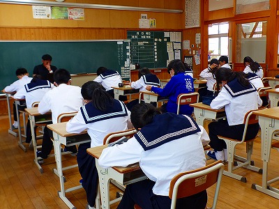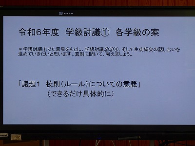 27日(月)の4校時は学級討議の時間でした。今年の生徒総会の全体討議は、「校則の意義について理解を深め、落ち着きのある学校を実現するために校則はどうあるべきか考える」となっています。各学級では、校則の意義などについて意見を出し合っていました。学級討議を経て、総会当日を迎えることになります。自分の考えを学級討議の場で積極的に出し、全体討議に臨んでほしいと思います。