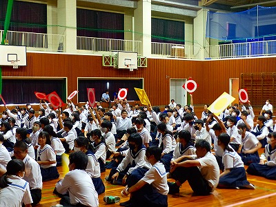 13日(月)の6校時は団練習を中心に行いました。エール交換はリーダーの見せ所です。各団員も、盛り上げに一役買います。また、全校ダンスの練習もしました。3年生が中心となって振り付けを工夫しています。大会当日を楽しみにしてください。